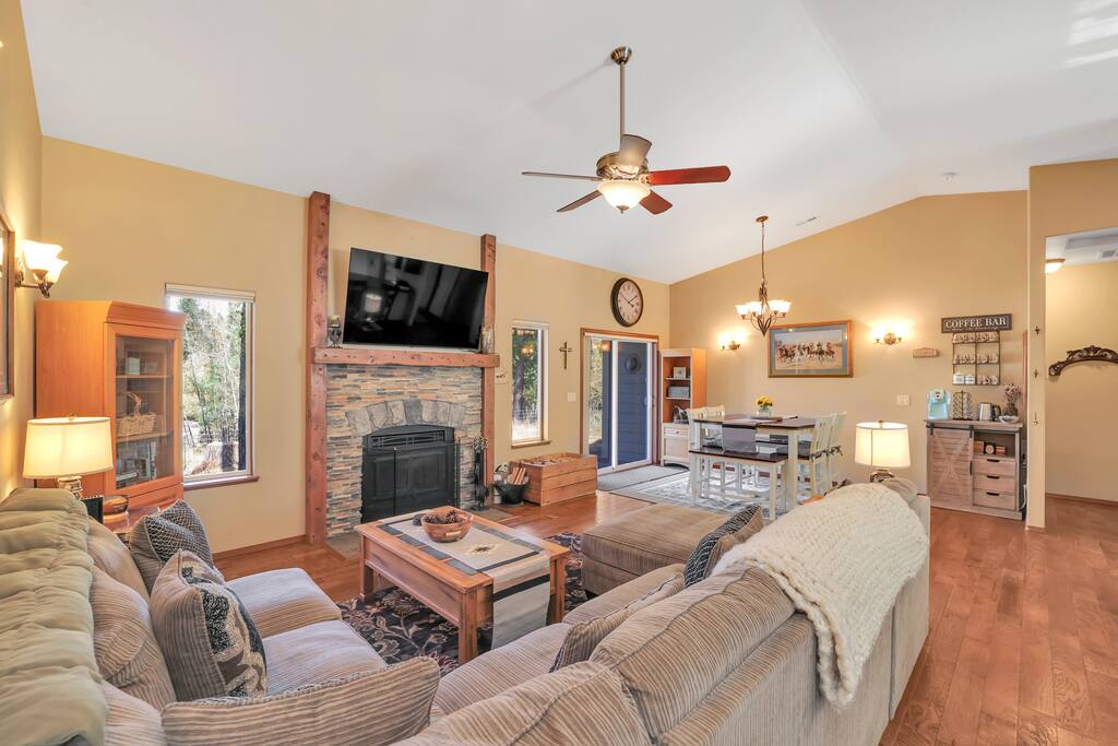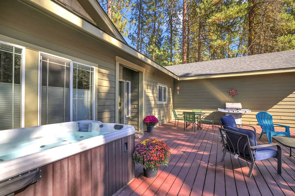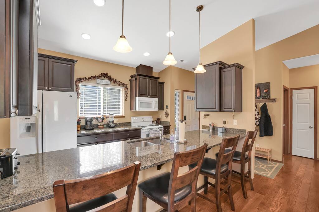 Step inside to vaulted ceilings, warm wood accents, and a cozy living room anchored by a stone fireplace and smart TV — perfect for movie nights or curling up after a day outdoors. The fully equipped kitchen with granite counters and bar seating makes cooking easy, while the dining area is ideal for shared meals and board games. SLEEPING ARRANGEMENT: Three bedrooms provide restful spaces for everyone: Primary Bedroom: King bed, en-suite bath, and natural light. Guest Bedroom 1: Queen bed with forest views. Guest Bedroom 2: Queen bed, perfect for kids or couples. Two bathrooms, a laundry room, and thoughtful touches like a dedicated coffee bar ensure comfort and convenience throughout your stay. OUTDOOR LIVING: Enjoy your morning coffee or evening glass of wine on the spacious deck, complete with outdoor seating, BBQ grill, and a private hot tub. The fenced yard and backdrop of towering evergreens create a peaceful, private setting — ideal for calm gatherings and stargazing under the McCall sky. LOCATION: Just minutes from Payette Lake, Ponderosa State Park, and McCall’s charming downtown shops and restaurants, this home is perfectly situated for year-round fun. Skiers and snowboarders will love the short drive to Brundage Mountain, while summer visitors can enjoy hiking, boating, fishing, and exploring hot springs. WHY YOU'LL LOVE IT: ★ Quiet neighborhood surrounded by nature ★ Spacious deck + private hot tub ★ Cozy fireplace for winter stays ★ Ideal for families, couples, or small groups ★ Quick access to downtown McCall, the lake, and outdoor adventures Come make memories in McCall — book your stay at this cozy, modern cabin retreat today!